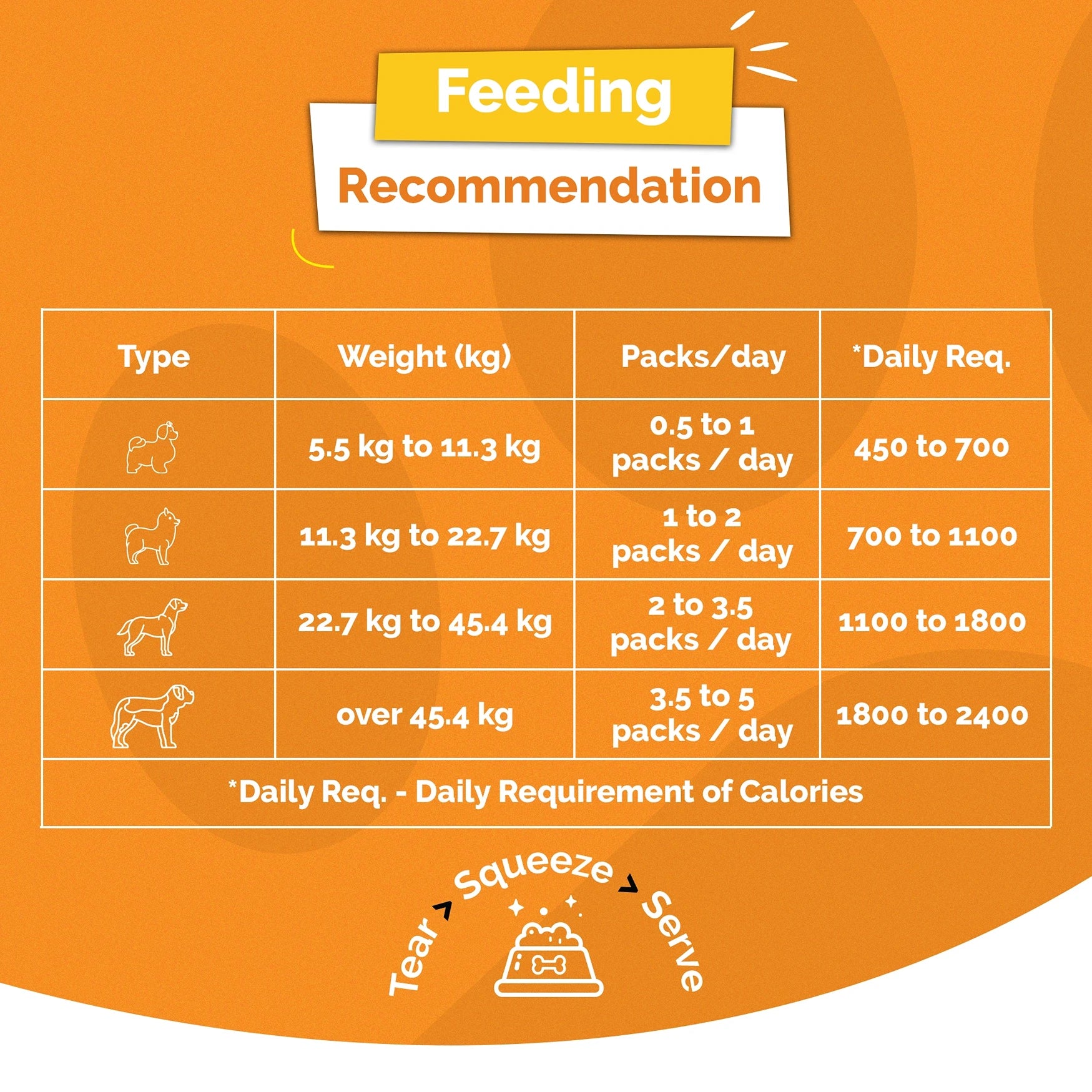 The feeding amount depends on your dog’s weight and activity level. For example, dogs weighing up to 5.5 kg require 1 pack/day, while larger dogs (22.7 kg to 45.4 kg) may need 5 to 10 packs/day. Check the feeding guide on the product packaging for specific recommendations based on your dog's size and needs.